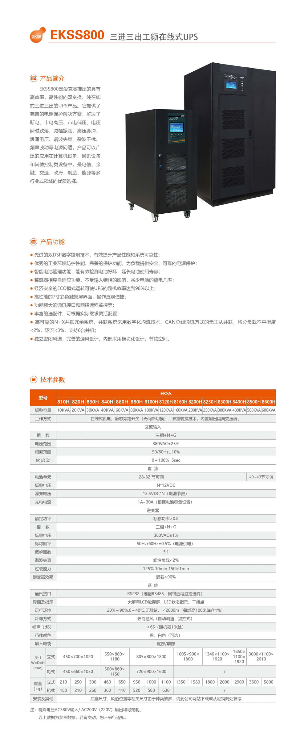 愛克賽EKSS800系列塔式三進三出工業(yè)級工頻在線式UPS電源采用在線式雙變換電路設(shè)計,DC/AC逆變器采用SPWM脈寬調(diào)制技術(shù)、IGBT功率模塊以及輸出隔離變壓器,使UPS的輸出為一外穩(wěn)頻穩(wěn)壓、純凈、不受電網(wǎng)波動干擾的正弦波電源。
